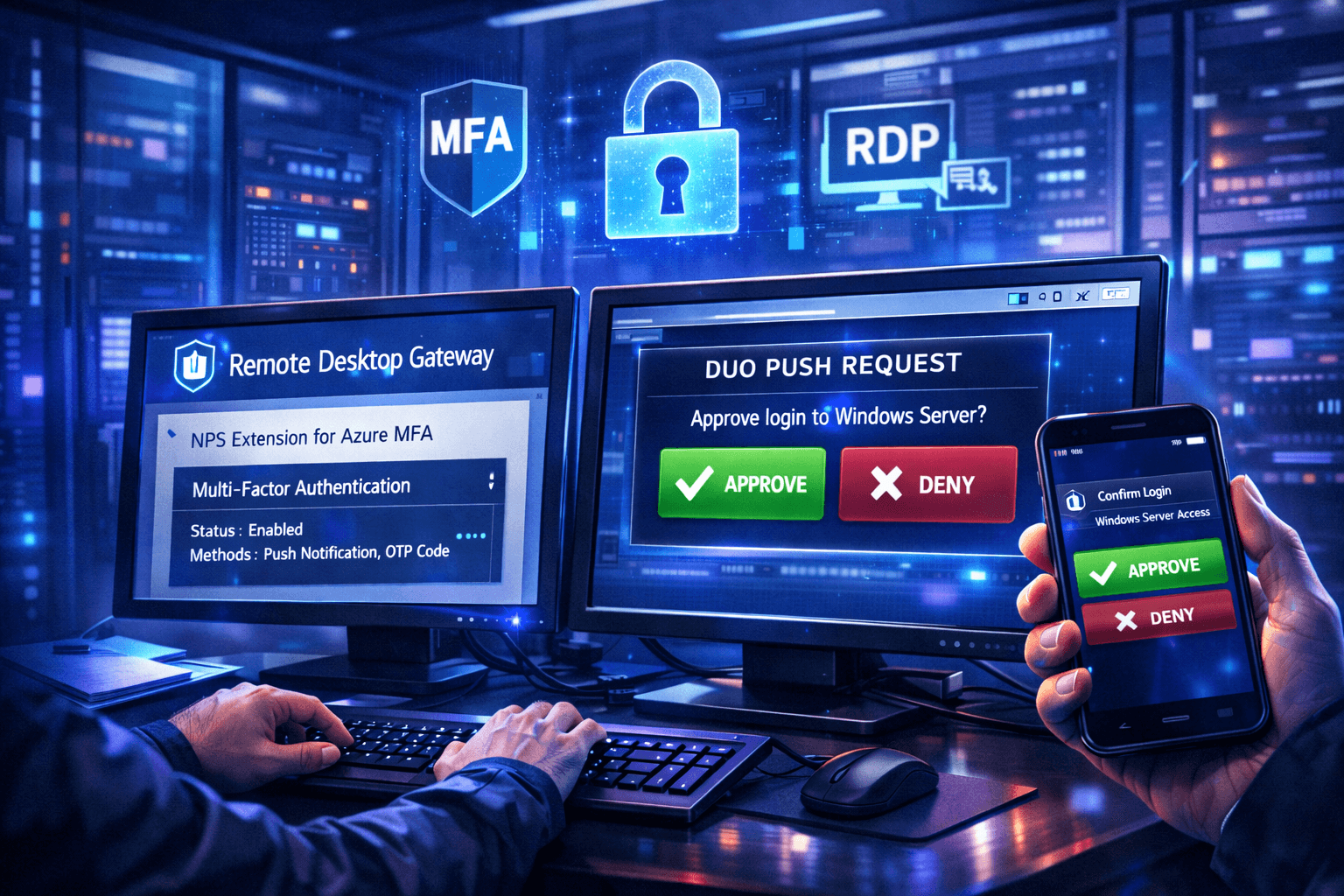 На Windows Server 2FA можно организовать несколькими способами. В классическом варианте с RDP на Windows Server рекомендуют использовать связку Remote Desktop Gateway + Network Policy Server (NPS) с Azure AD (Entra ID). Microsoft выпускает расширение NPS Extension for Azure MFA: после его установки все RDP-сессии через шлюз будут требовать дополнительную проверку через мобильное приложение (Microsoft Authenticator или другой поддерживаемый фактор).