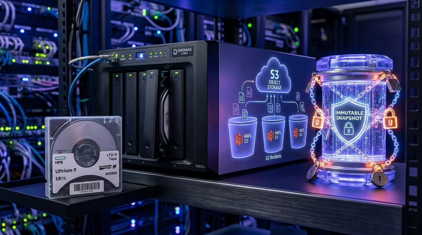 Сетьевые накопители (NAS) и дисковые массивы: удобны для быстрого отката и восстановления. NAS может быть установлен в офисе или удалённом ДЦ и служить первой копией бэкапов. Но их надо дополнительно защищать: на NAS включить immutability на файловых шарингах (если поддерживается), ограничить сетевой доступ и зарезервировать место на удалённом расположении.