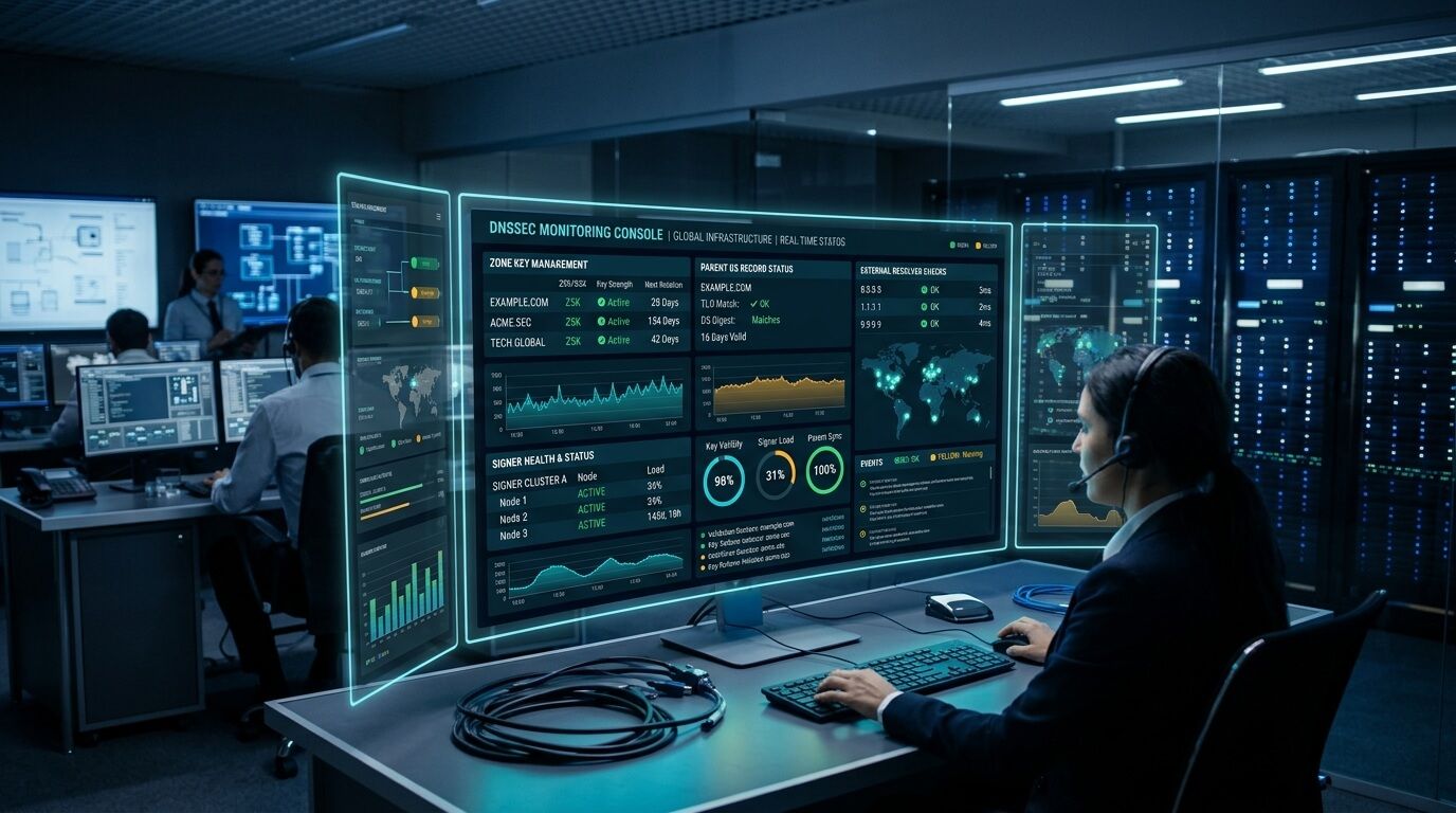 DNSSEC нельзя считать “включённым и забытым”. Нужно мониторить как минимум четыре сущности: присутствие и корректность DS у родителя, набор опубликованных DNSKEY/RRSIG в child zone, ошибки валидации у внешних recursive resolvers и внутреннее состояние signer’а. Для AWS Route 53 есть отдельный статус в GetDNSSEC, включая INTERNAL_FAILURE, который часто указывает на проблемы с KMS key или его permissions. Для BIND и PowerDNS критичны события вокруг re-signing, key state transitions и репликации на secondaries.