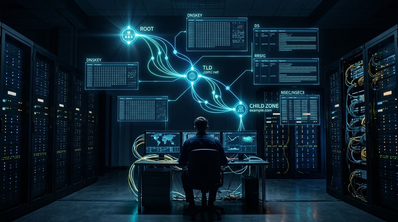Практически оператору нужны не “все RFC”, а понимание пяти вещей: где лежит публичный ключ дочерней зоны (DNSKEY), как родитель указывает на него (DS), чем подписаны ответы (RRSIG), как доказывается отсутствие имени или типа (NSEC/NSEC3), и какие TTL/тайминги влияют на кэширование в момент включения, rollover и отката. Именно на стыке DNSKEY ↔ DS ↔ TTL чаще всего и рождаются outage’ы.