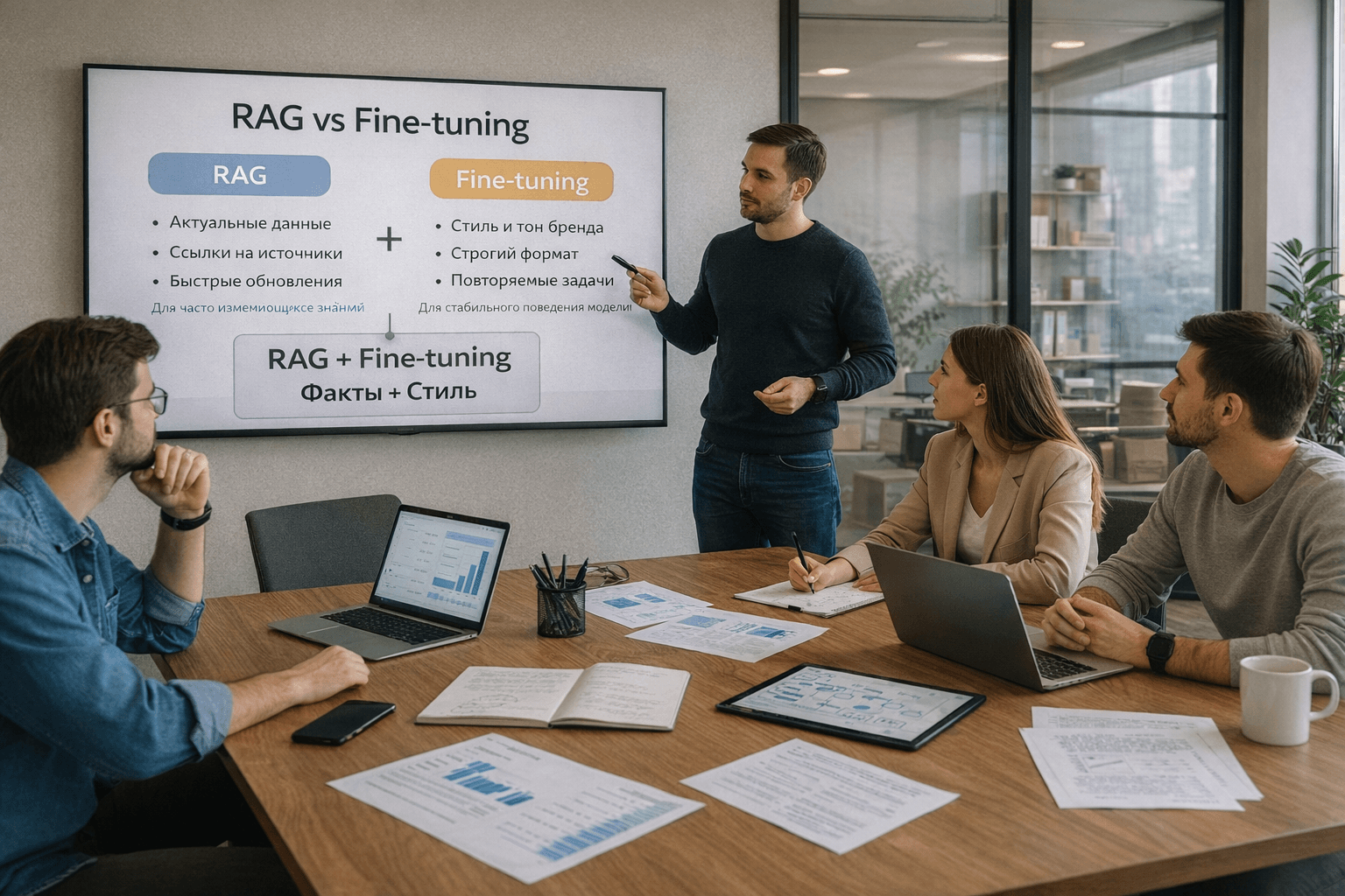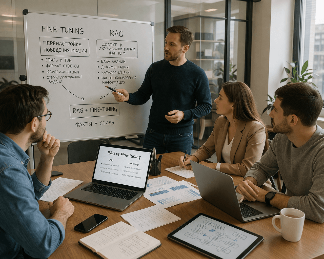 RAG отвечает за доступ к актуальным знаниям. Fine-tuning — за устойчивое поведение модели поверх этих знаний. Один приносит факты, второй — форму.