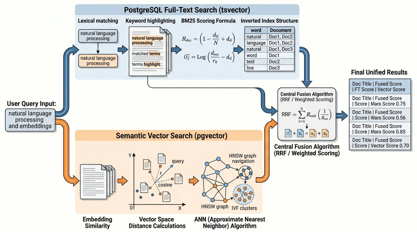 Для RAG-пайплайна особенно полезны две возможности pgvector. Первая — гибридный поиск: документация прямо рекомендует использовать векторный поиск вместе с PostgreSQL full-text search и объединять результаты RRF или cross-encoder’ом. Вторая — индексация представлений: можно строить expression indexes для subvector(...), binary_quantize(...) или halfvec, а затем делать re-rank по исходным векторам. Это даёт хороший operational path для крупных коллекций: быстрый грубый кандидат-генератор, затем точная сортировка на коротком хвосте.