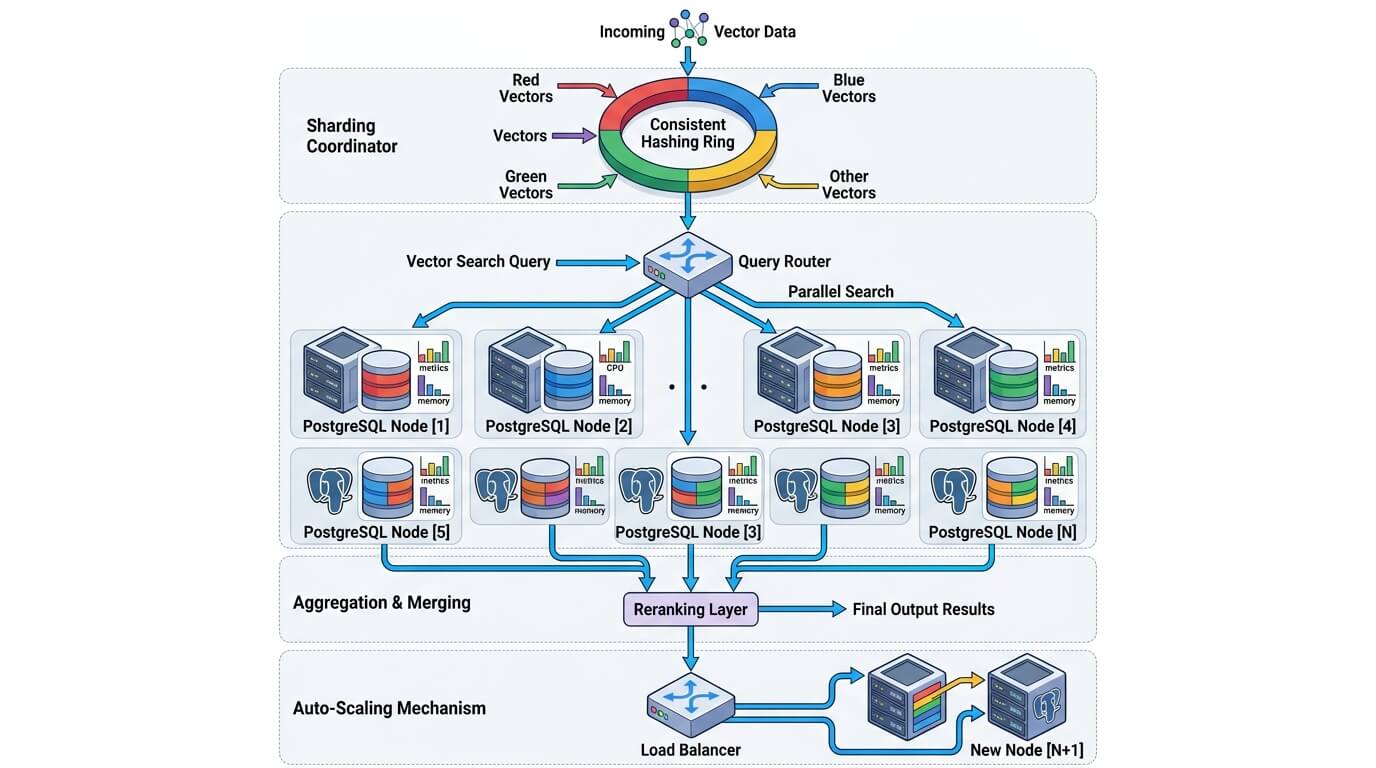 Масштабируется pgvector так же, как сам PostgreSQL. Документация pgvector прямо советует вертикальное масштабирование, реплики для горизонтального чтения и Citus или иной sharding-подход для распределения данных; PostgreSQL, в свою очередь, для больших таблиц рекомендует partitioning, потому что оно улучшает locality, позволяет быстро удалять/архивировать старые куски и помогает держать рабочую часть индексов в памяти. Для RAG это обычно означает: сначала single-node + replica, затем partitioning по tenant/date/collection и только потом шардинг.