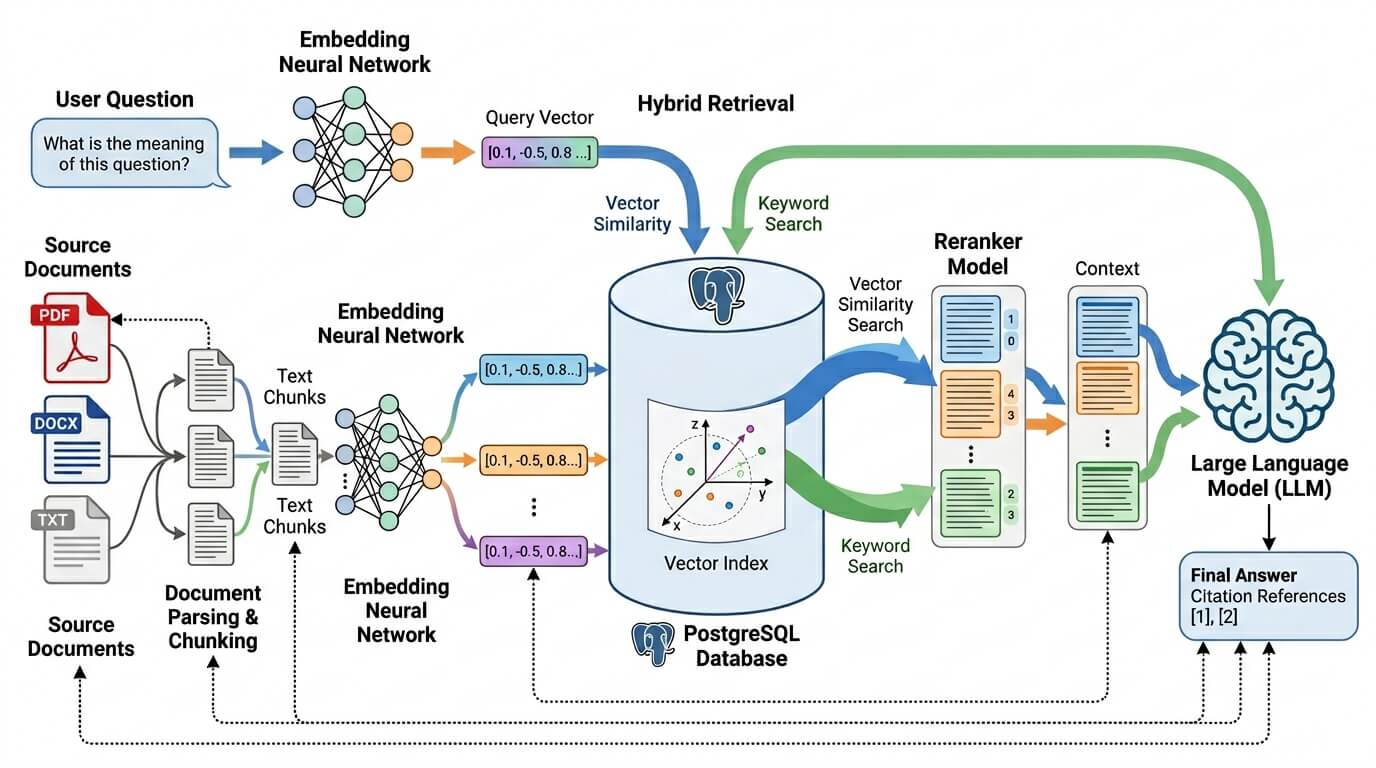 Сильная сторона именно pgvector в том, что вектор остаётся «рядом» с реляционными данными. Репозиторий расширения перечисляет поддержку обычных и approximate nearest neighbor запросов, типов vector, halfvec, bit, sparsevec, нескольких метрик и при этом отдельно подчёркивает преимущества PostgreSQL — ACID, point-in-time recovery, JOIN и всё остальное, что уже умеет сервер. Для RAG это означает меньше системных разрывов: не нужно выносить метаданные в одну БД, а эмбеддинги — в другую, если ваши SLA, объём и бюджет укладываются в один кластер PostgreSQL.