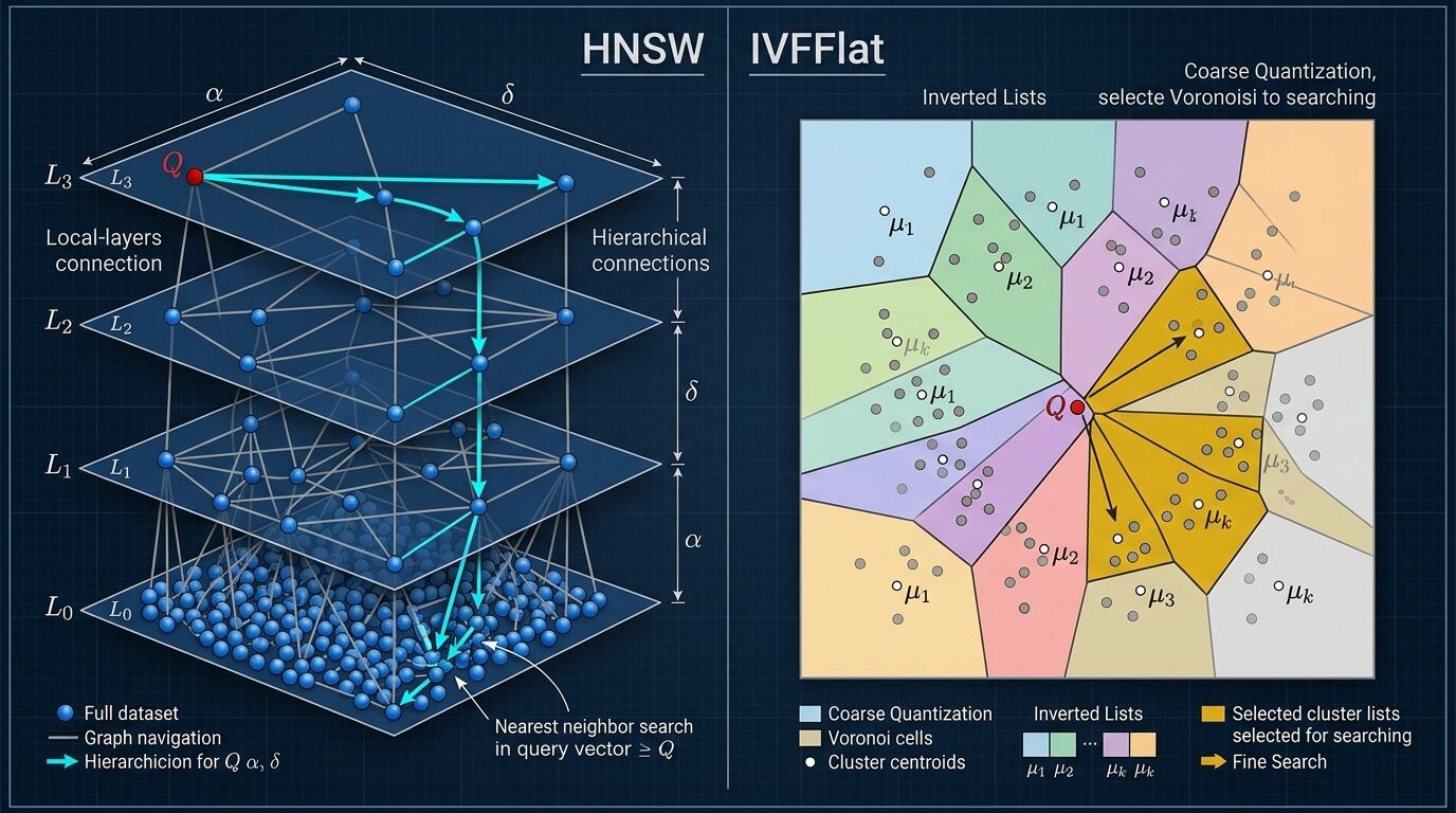 В документации pgvector этот контраст сформулирован очень прямо. HNSW создаёт multilayer graph, имеет лучший speed/recall trade-off, но строится дольше и ест больше памяти; зато его можно создать даже на пустой таблице, потому что training step ему не нужен. IVFFlat, наоборот, делит векторы на lists, строится быстрее и использует меньше памяти, но уступает HNSW по speed/recall trade-off и требует уже имеющихся данных для хорошего обучения coarse partitioning.