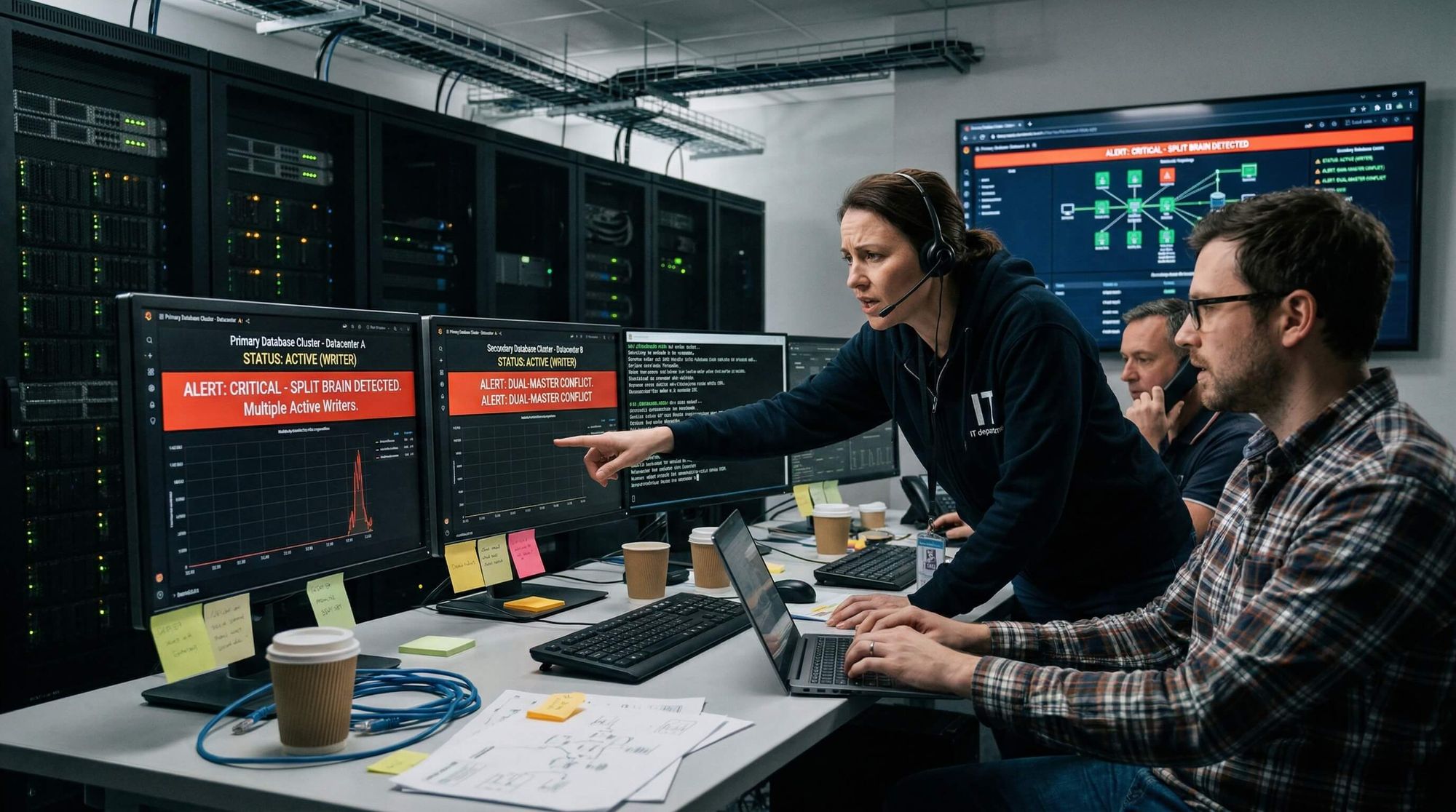 | Split‑brain / двойной мастер | остановить хаос | немедленный fencing, затем выбор авторитетного мастера и, как правило, пересборка второй стороны + верификация данных | высокий |